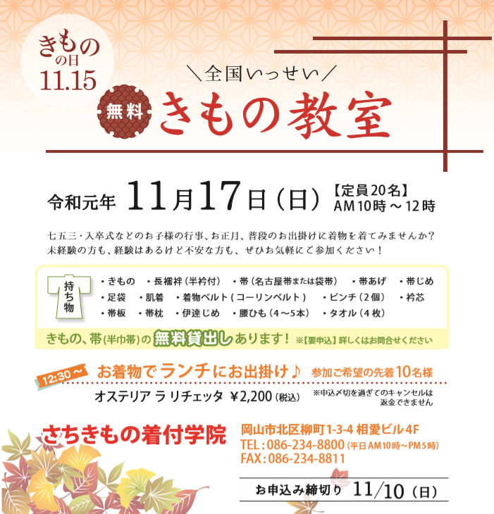 | さちきもの着付学院 岡山市北区柳町1-3-4 相愛ビル4階 |