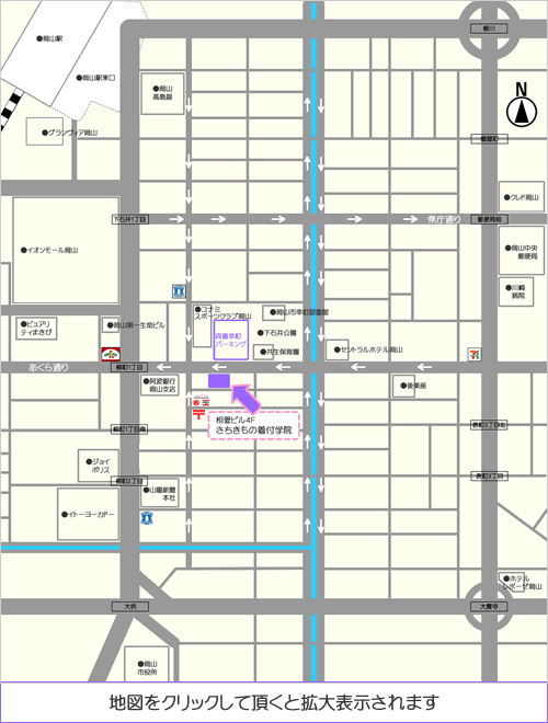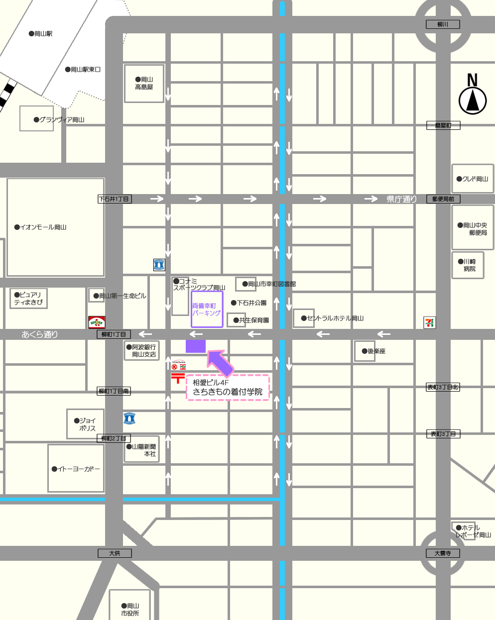 学院周辺の地図です。矢印は一方通行となっておりますのでお車でお越しの際はご注意ください。