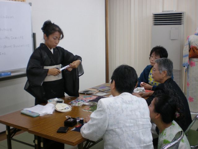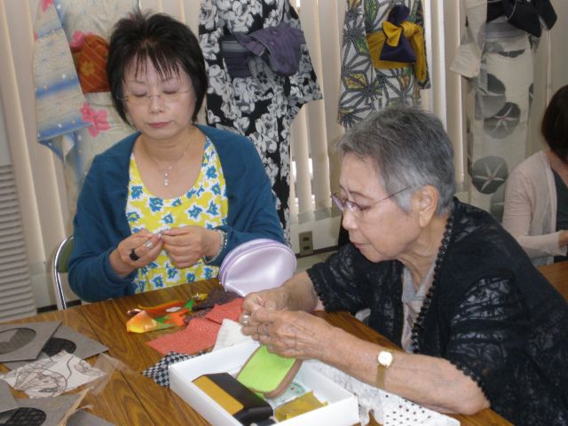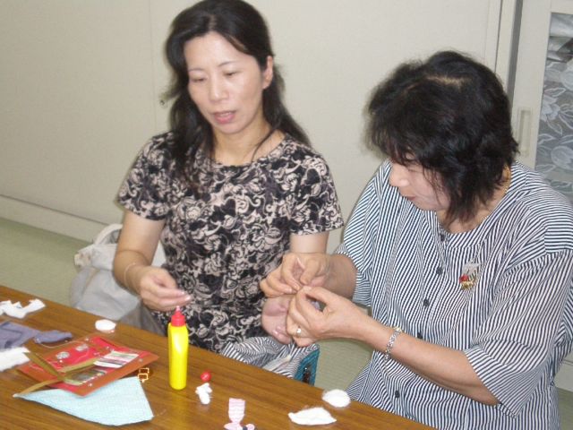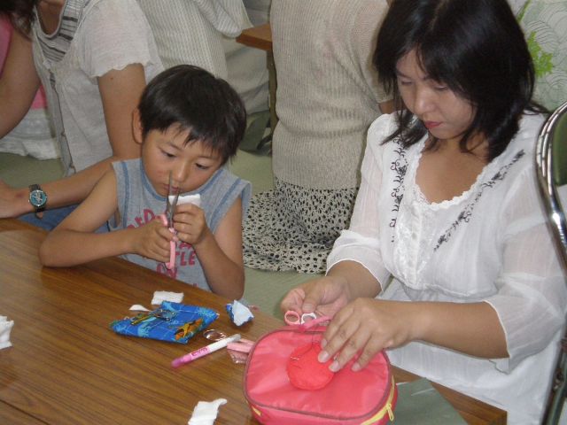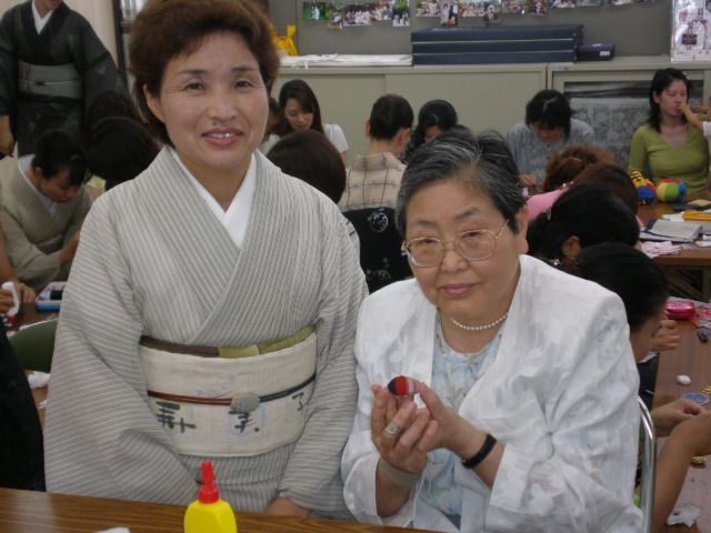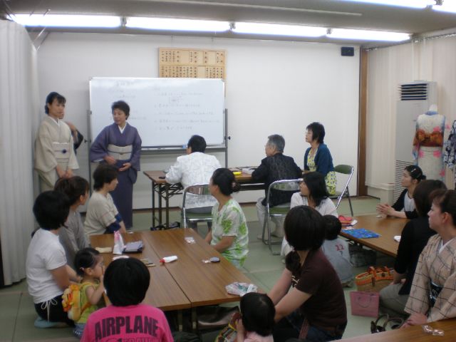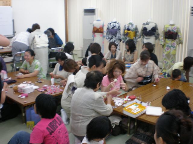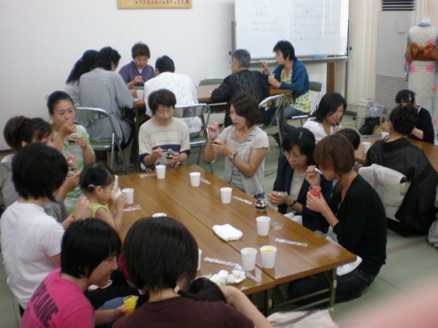 夏のお楽しみ会・帯留めづくり 2007 08.02 2007.08.02 夏のお楽しみ会に帯留め作り体験を行いました。当日は小さな子供さんも含めたくさんの方が参加して下さりとてもにぎやかで楽しい会となりました。 真剣に作り方の説明を聞き・・・ 和気あいあいと楽しく帯留め作り みんな思い思いの素敵な 帯留めが出来ました 頑張った後は楽しいティータイム おいしいデザートにニッコリ!