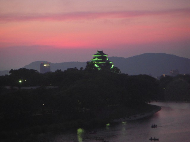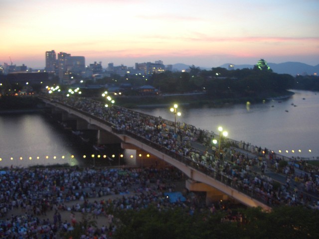 岡山城もライトアップされ いよいよ花火大会のはじまりです。 |
