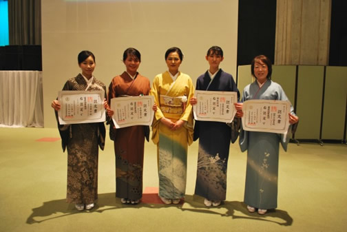 | 左から三宅講師「着装指導講師」認定 平嶋講師「着装指導講師」認定 学院長 庄谷内講師「准教授補」認定 田中講師「着装指導講師」認定 |