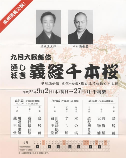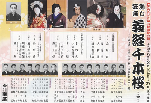 2010.09.26(日) 京都 南座にて公演中の歌舞伎「義経千本桜」を観に行ってきました。一階花道のすぐ側の席だったので、役者さん達の息遣い・足裁き・衣装を間近で感じることが出来ました。