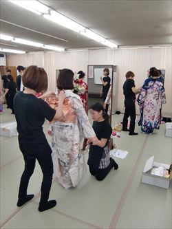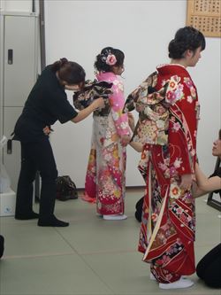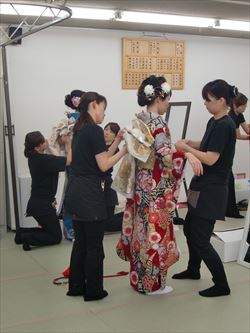 2014.01.12(日)「ジョイフル恵利」さん・「三喜」さんのご依頼で、岡山市の成人式に出席されたお嬢様方のお支度を私共のスタッフでお手伝いさせていただきました。着付けの写真は「ジョイフル恵利」さんのお手伝いの様子です。