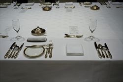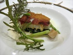 献立 瀬戸内鯛とアオリイカの ホワイトバルサミコマリネ グリーンマスタードソース 冷製グリーンピーススープ 黒タピオカ入りコンソメジュレ 舌平目のウィーン風 ノイリークリームソース 牛フィレ肉とバターナッツの重ね焼き グレービーソース シェラトン特製デザート パン コーヒー |