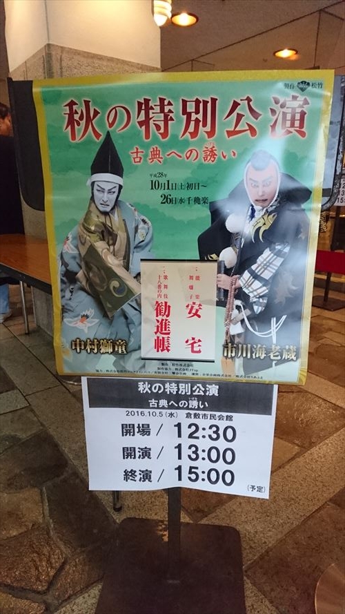 歌舞伎鑑賞 2016 10.05 10月05日(水)倉敷市民会館で催された市川海老蔵さん主演『秋の特別講演 古典への誘い』に行ってきました。歌舞伎の写真は撮れないのでランチと美観地区での様子です。 参加された皆さん 『秋の特別講演 古典への誘い』 一. 能楽 舞囃子 「安宅」 二. 歌舞伎 一八番の内 「勧進帳」 武蔵坊弁慶 … 市川 海老蔵 源義経 … 市川 九團次 亀井六郎 … 市川 右の助 片岡八郎 … 片岡 市蔵 駿河次郎 … 大谷 廣松 常陸坊海尊 … 市村家 橘 富樫左衛門 … 中村 獅童 山陽新聞社 営業局 事業本部 企画推進室室長 春木香里さん チケットの手配で大変お世話に なりました。 ありがとうございました。