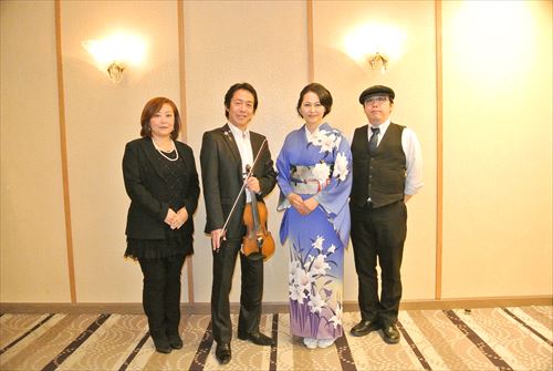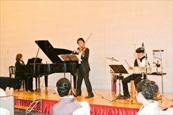 | ヴァイオリン&ピアノ&パーカッションのジョイントコンサートでお世話になった方々と 左から名定澄子さん(ピアノ)・井上雅善さん(ヴァイオリン)・小林俊介さん(パーカッション) |