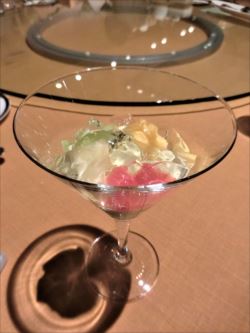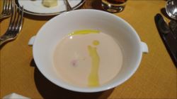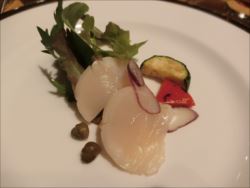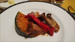 帆立貝のカルパッチョ 野菜のグリル レモンドレッシング 蕪のクリームスープ パルマ産生ハム ヴァージンオリーブオイル 旬の魚のオリーブオイル焼き ズッキーニと茄子のグラタン 国産豚肩肉のセージマリネロースト ピスタチオのパンナコッタとフルーツ コーヒー 紅茶 |