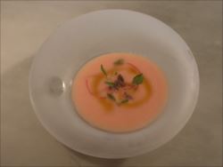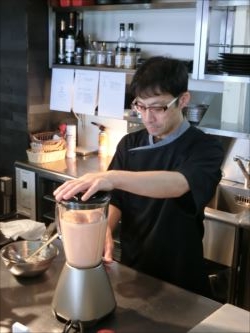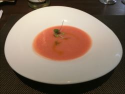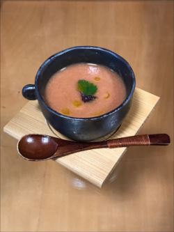 ずっと使っていなかったミキサーを出して、普通のトマトで作ってみました。シェフの真似をして桃の種がきれいに取れてすごく気持ち良かったです。かなり桃が甘かったので味を思い出しながら再現しました。結構近づけたと思います。