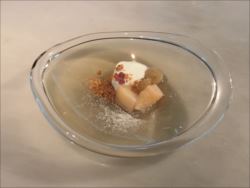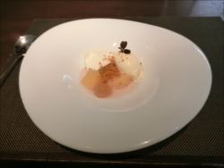 桃とフルーツトマトのスープ 国産豚肉のロースト カボチャとシェリーヴィネガー 蜂蜜のソース ハーブのブランマンジェ |