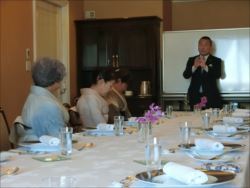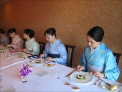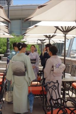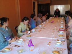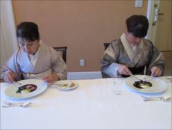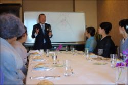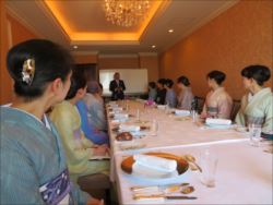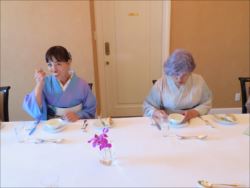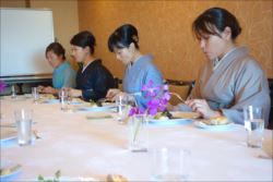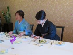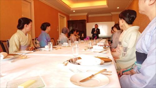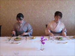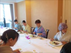 テーブルマナー講習会 2018 08.22 2018.08.22 (水) 『ホテル ラ・スイート神戸ハーバーランド』にてテーブルマナー講習会を行ないました。参加された皆様の夏の着物が素敵でした。 講 師 ホテル ラ・スイート神戸ハーバーランド 総支配人 桧山 和司さん MENU ・瀬戸内海産海の幸のサラダ仕立て バルサミコヴィネガー風味 ・兵庫県産トウモロコシの冷たいクリームスープ パセリ風味 ・瀬戸内産天然真鯛のポワレ ホウレン草添え アンチョビソース ・特選牛の赤ワイン煮込み ジャガイモのピュレを添えて ・兵庫県産桃のコンポート ハイビスカスの香り 赤桃のムースとフランボワーズのソルベ添え ・コーヒー