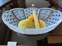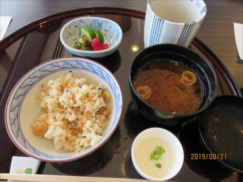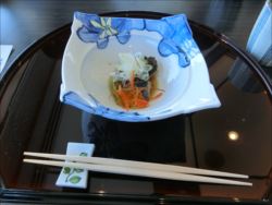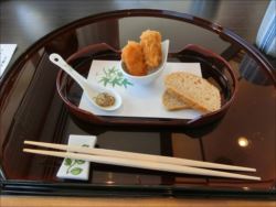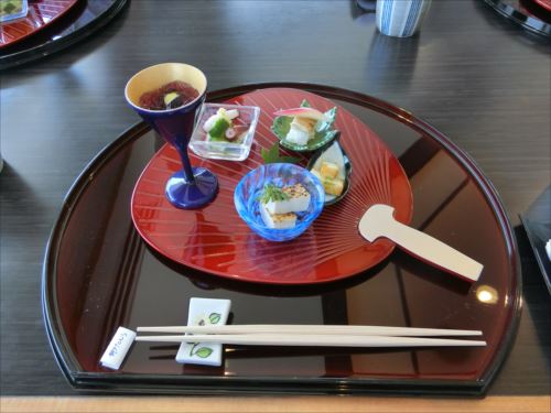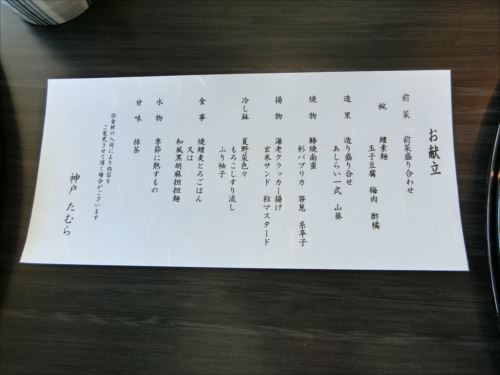 ・前菜…前菜盛り合わせ ・椀…鱧素麺 玉子豆腐 梅肉 酢橘 ・造里…造り盛り合わせ あしらい一式 山葵 ・焼物…鯵焼南蛮 彩パプリカ 笹葱 糸辛子 ・揚物…海老クラッカー揚げ 玄米サンド 粒マスタード ・冷し鉢…夏野菜色々 もろこしすり流し ふり柚子 ・食事…焼鱧麦とろごはん 又は 和風黒胡麻担担麺 ・水物…季節に熟すもの ・甘味…抹茶 |