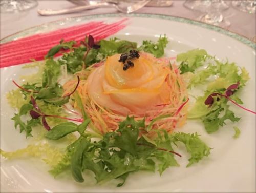 MENU 50周年のお祝いに 滑らかな京都産蕪のクリームスープ 新鮮鱸のポワレに林檎のソテーを飾って 特選牛フィレ肉のロースト エシャロット風味 伝統のマデラソース シェフパティシエお薦めお祝いデザート コーヒー 自家製各種パン・バター