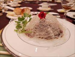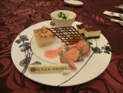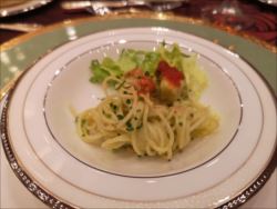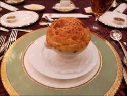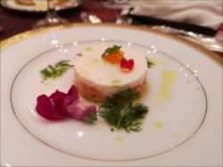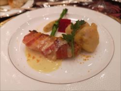 献立 スモークサーモンとチーズ チキン入りクリームポテトスープのパイ包み焼き アボカド、トマトの冷製パスタ 真名鰹のパンチェッタロールとイカチチのポワレ ブールブランソース 牛フィレステーキ野菜添え 赤ワインソース チーズケーキブリュレとティラミス、ピスタチオアイス デミコーヒー or 紅茶 パン2種