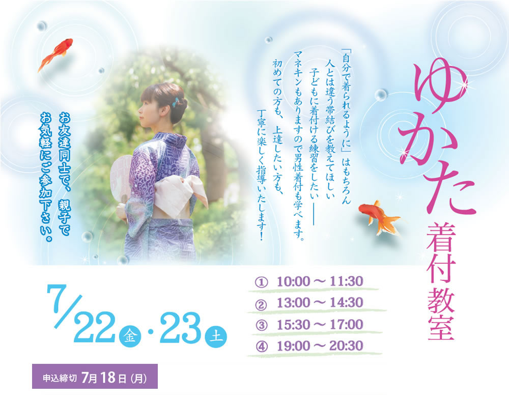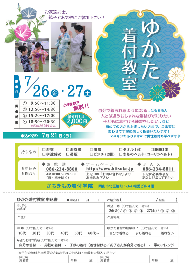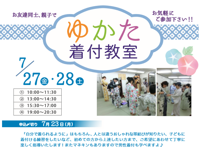 浴衣の季節に向けて半巾帯の変わり帯結び講習会を行います。