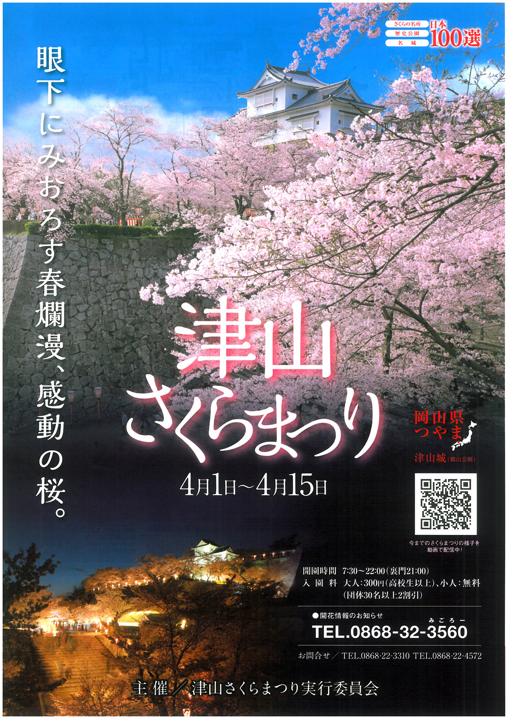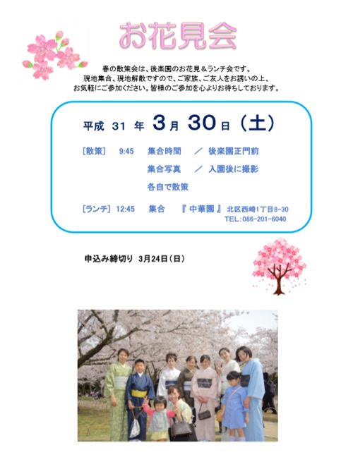 今年最初の散策会は、津山城の鶴山公園のお花見を予定しています。数千本と言われる桜が園内を埋め尽くし、日本のさくら100選に選ばれている岡山髄いつのさくらの名所をお着物で歩きましょう。