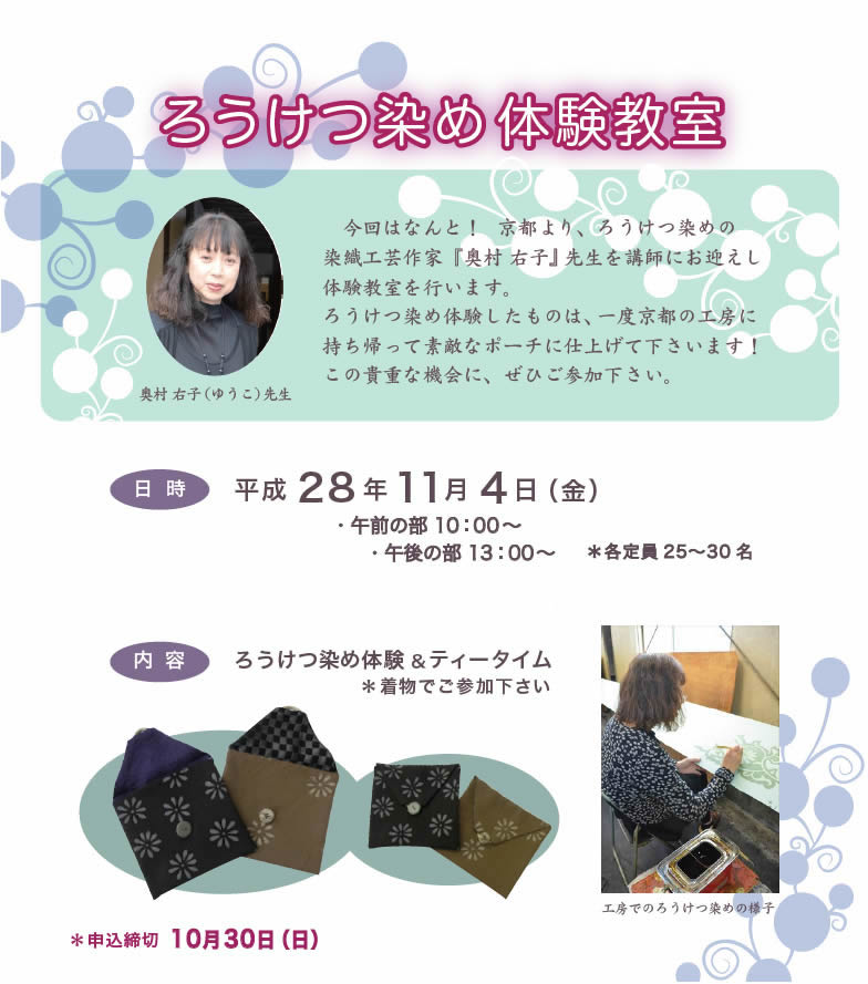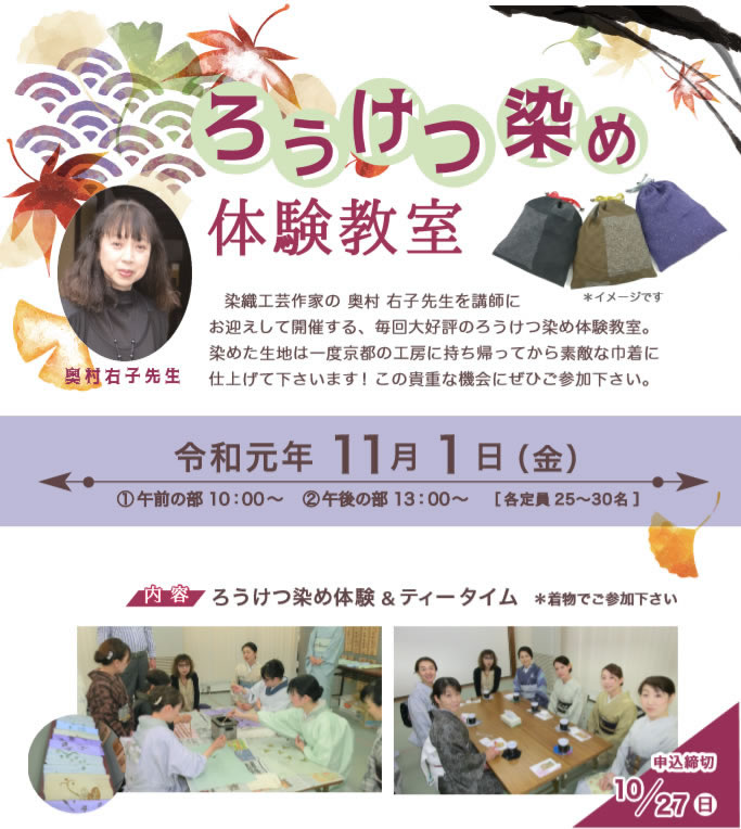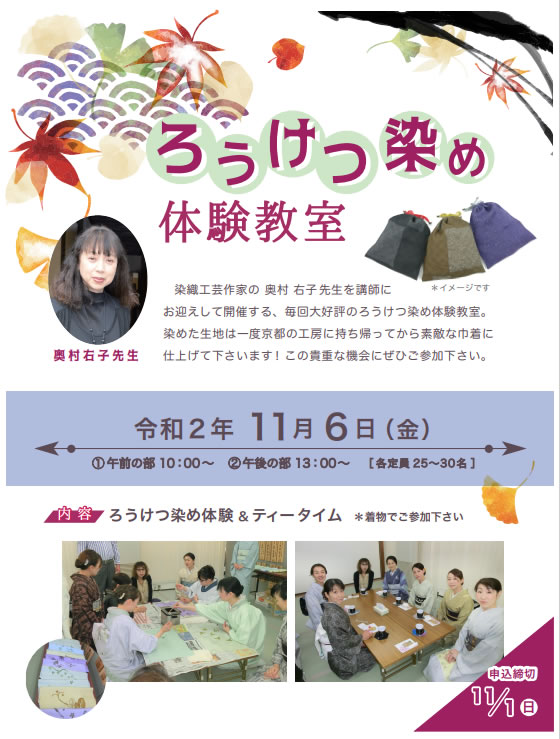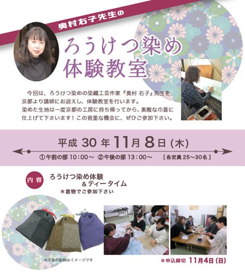 写真は昨年11月に行った『ろうけつ染め体験教室』の様子です。