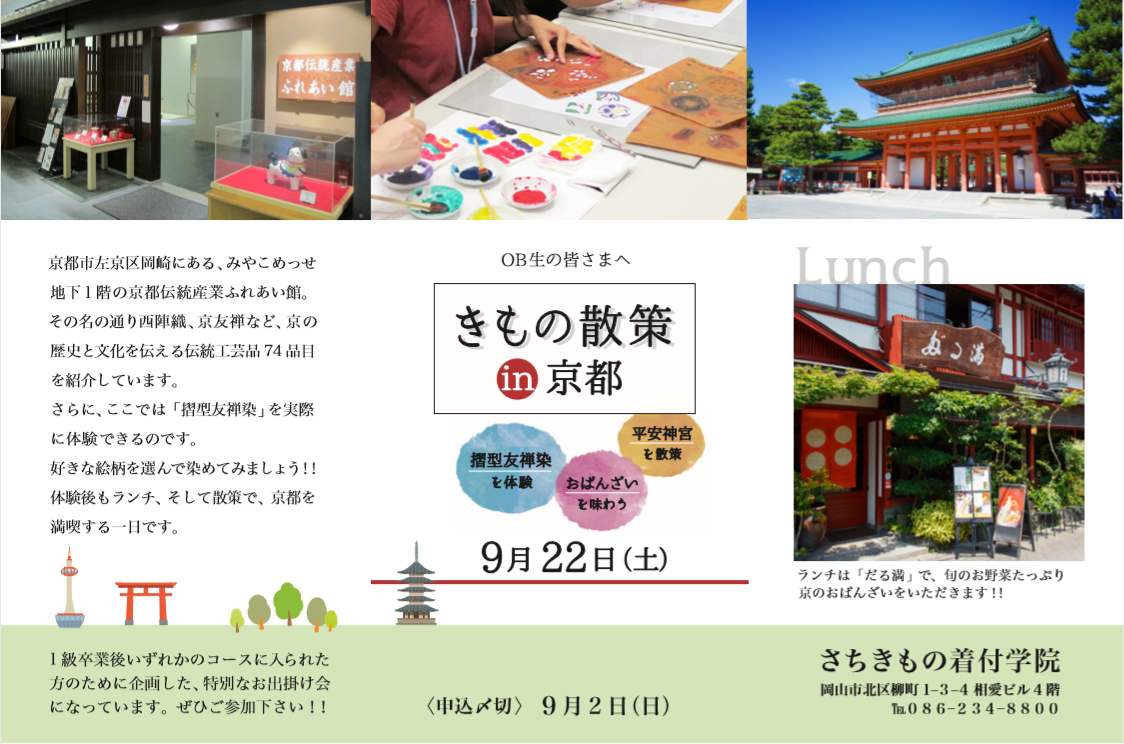 普段、足を踏み入れることの出来ない、着物作家先生の工房見学や一年前から予約しなければ味わう事の難しい、 イタリアンのランチでさちきもの着付学院ならではの特別な京都をご一緒に楽しみましょう。