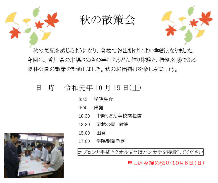金毘羅さんの散策と中野うどん学校(香川県)での「秋の散策会」を予定しています。